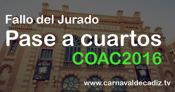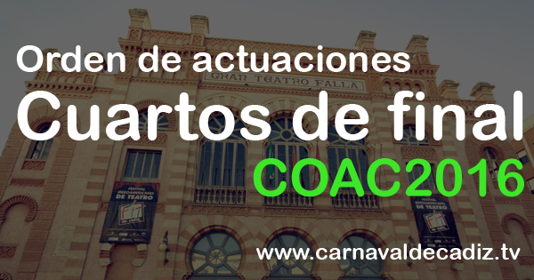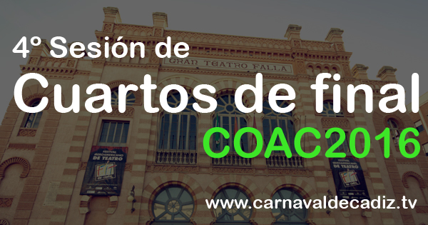El día 28/01/2016 comienza la 4º sesión de Cuartos de final en este COAC 2016. A continuación listamos las agrupaciones cabeza de serie, es decir, agrupaciones que accedieron a la final o semifinal el año anterior.
