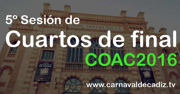El día 29/01/2016 comienza la 5º sesión de Cuartos de final en este COAC 2016. A continuación listamos las agrupaciones cabeza de serie, es decir, agrupaciones que accedieron a la final o semifinal el año anterior.
